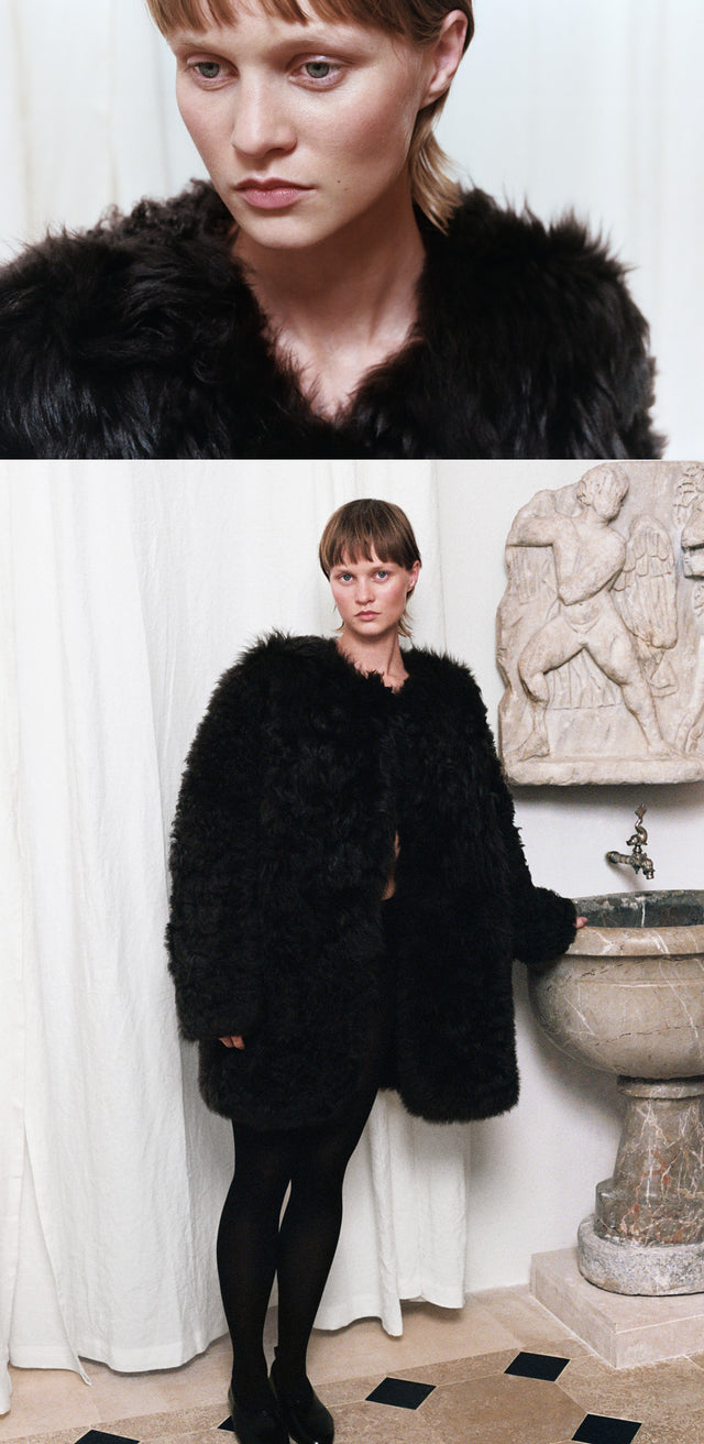 An oversized suit taken from the male wardrobe appears alongside a pared-down strapless wool dress. Shearling warms the body, while leathers glow in deep olive green or glossy black. Fine-gauge knits glide softly over the skin. Ivory Théa pumps, the Suzanna patent leather bag and a pleated silk scarf complete this sophisticated and understated look.