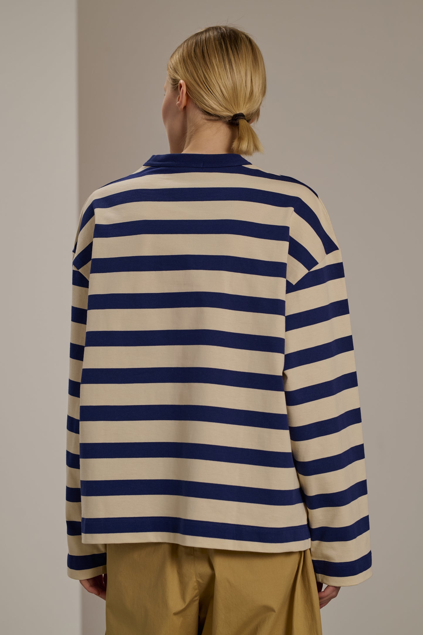 ARCHIE is our new sailor-stripe shirt. This version, sporting wide off-white and blue stripes, is made from organic cotton jersey. Its decidedly oversized cut can be worn as a relaxed T-shirt against the skin, or layered like a thin sweatshirt. The 'Soeur' logo is embroidered on the front.
